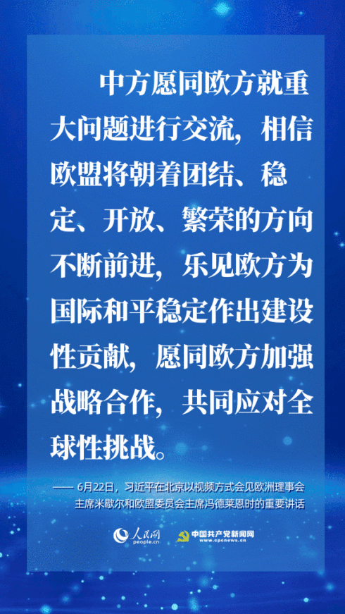 在此次会见中,习近平指出,新冠肺炎疫情发生以来,中国和欧盟相互支持、相互帮助。中方愿同欧方携手努力,推动“后疫情时代”中欧关系更加稳健成熟,迈向更高水平。