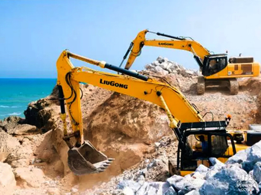 △2017年,摩洛哥首都拉巴特,大西洋海岸施工现场,柳工挖掘机进行大块石料的堆积作业。(资料图)