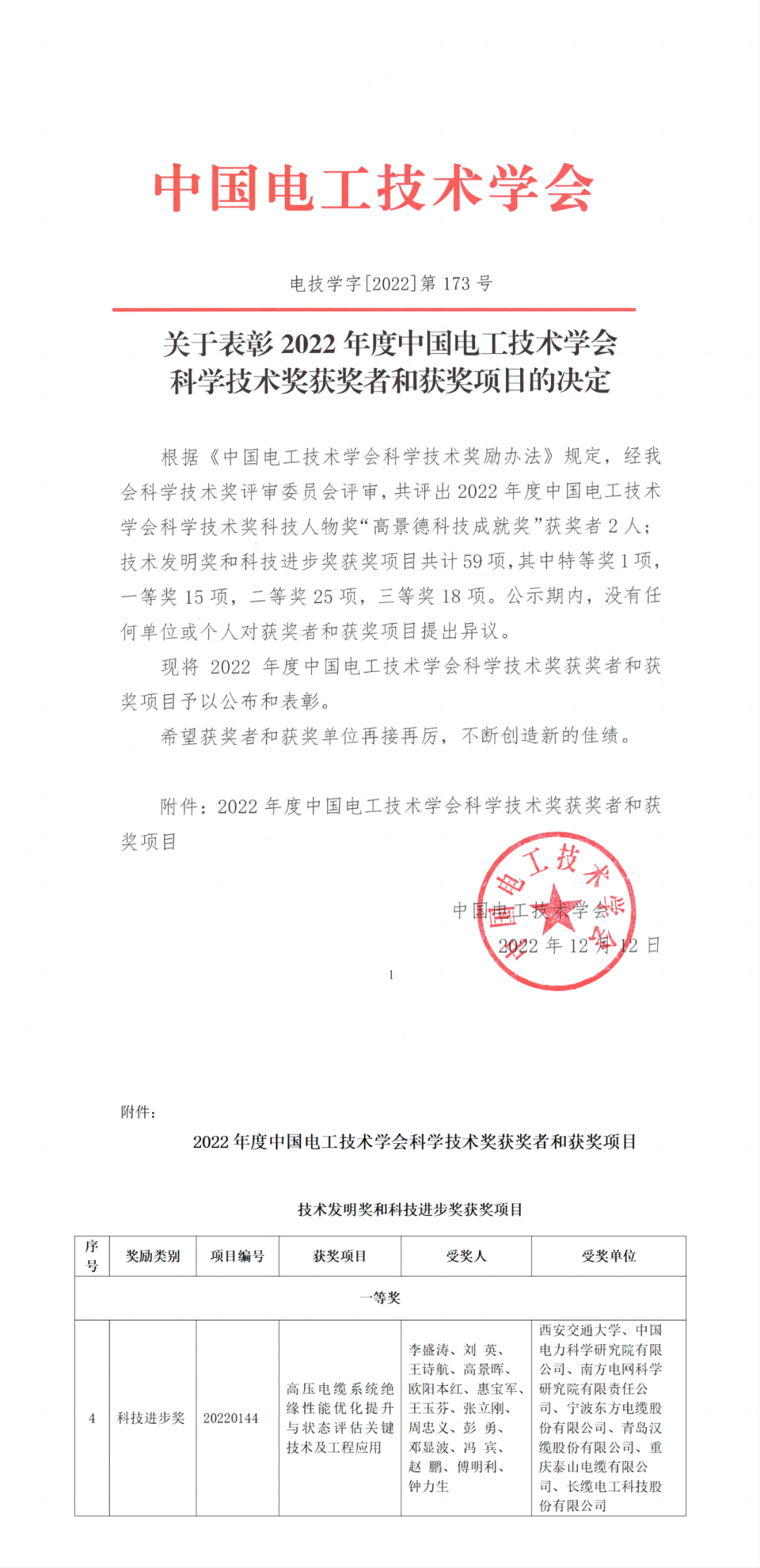 长缆科技携手西安交通大学、中国电力科学研究院、南方电网科学研究院等单位共同承担的“高压电缆系统绝缘性能优化提升与状态评估关键技术及工程应用”项目获得科技进步奖一等奖。