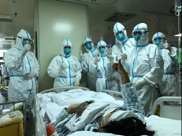 “解放军来了,我们更加坚定必胜信心!”看到军队的医疗队员出现在面前,一名重症患者情不自禁举起大拇指“点赞”。(图片来源:军报记者微信公众号)