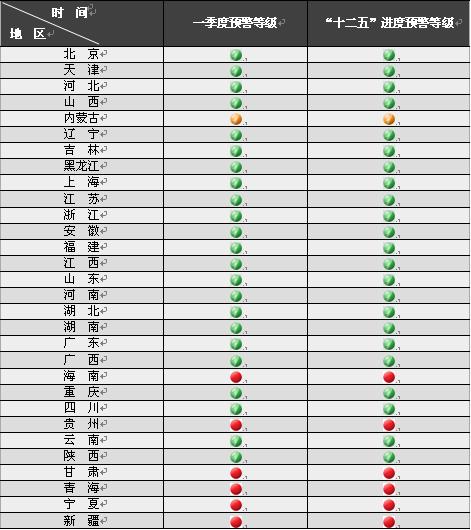 近日,国家发展改革委发布了各地区2012年一季度节能目标完成情况晴雨表。海南、贵州、甘肃、青海、宁夏、新疆等6个地区预警等级为一级,节能形势十分严峻;内蒙古预警等级为二级,节能形势比较严峻;北京、天津、河北、山西、辽宁、吉林、黑龙江、上海、江苏、浙江、安徽、福建、江西、山东、河南、湖北、湖南、广东、广西、重庆、四川、云南、陕西等23个地区预警等级为三级,节能工作进展基本顺利。西藏缺乏统计数据,没有进行预测。