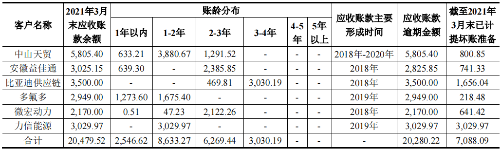 振华新材的客户集中度较高,2018年-2021年第一季度该公司对前五大客户销售金额占当期营业收入的比例分别为85.67%、93.55%、89.56%、95.39%。其中,宁德时代是振华新材的第一大客户。2021年第一季度,振华新材对宁德时代销售金额为6.4亿元,占营业收入的65.11%。