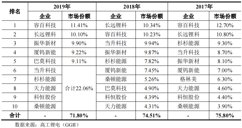 从全球三元正极材料市场竞争格局来看,根据高工锂电(GGII)调研数据,2019年住友金属、LGC、优美科位于全球出货量前1-3名,中国企业容百科技、长远锂科、振华新材位于第4-6名。