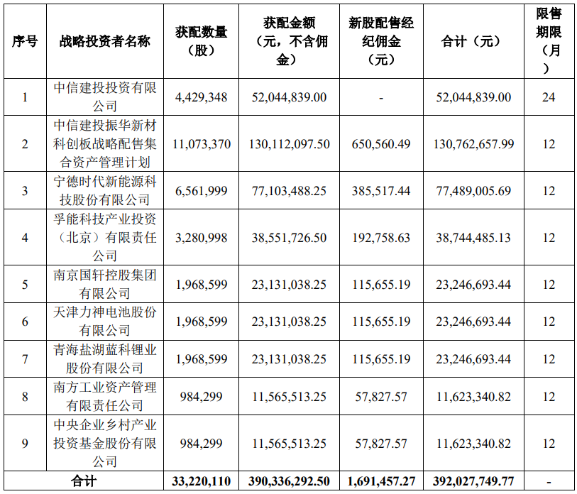 本次发行的初始战略配售数量为3322万股,占发行总规模的30%。宁德时代、孚能产投、南京国轩、天津力神、蓝科锂业、南方资产等产业上下游企业参与了振华新材的战略配售,并就市场、技术、供应链等内容与公司签订了《战略合作协议》。其中宁德时代、孚能科技、南京国轩是振华新材的主要客户,蓝科锂业是振华新材的锂资源供货商。