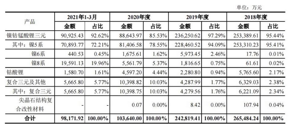 振华新材的锂电池正极材料以三元正极材料为主,即以镍、钴、锰/铝为原料制成的三元复合正极材料。三元正极材料业务为振华新材营业收入的主要构成,报告期内占比均在85%以上。其中镍5系是三元正极材料的主要产品,但镍8系产品销售收入占比提升速度显著。