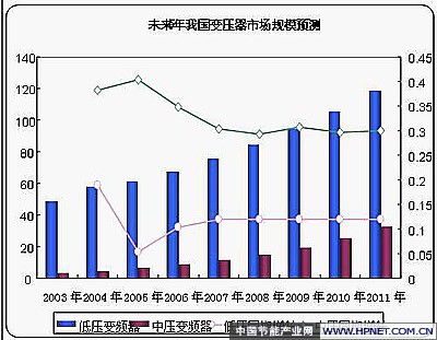 据统计,在过去的几年内中国变频器的市场保持着12%~15%的增长率,这个速度己经远远超过了近几年GDP的增长水平,预计至少在未来5年内将会保持10%以上的增长率。目前,中国市场上变频器安装容量(功率)的增长率实际上在20%左右,按照这样的发展速度和中国市场的需求来计算,至少在10年以后变频器市场才能饱和并逐渐成熟。