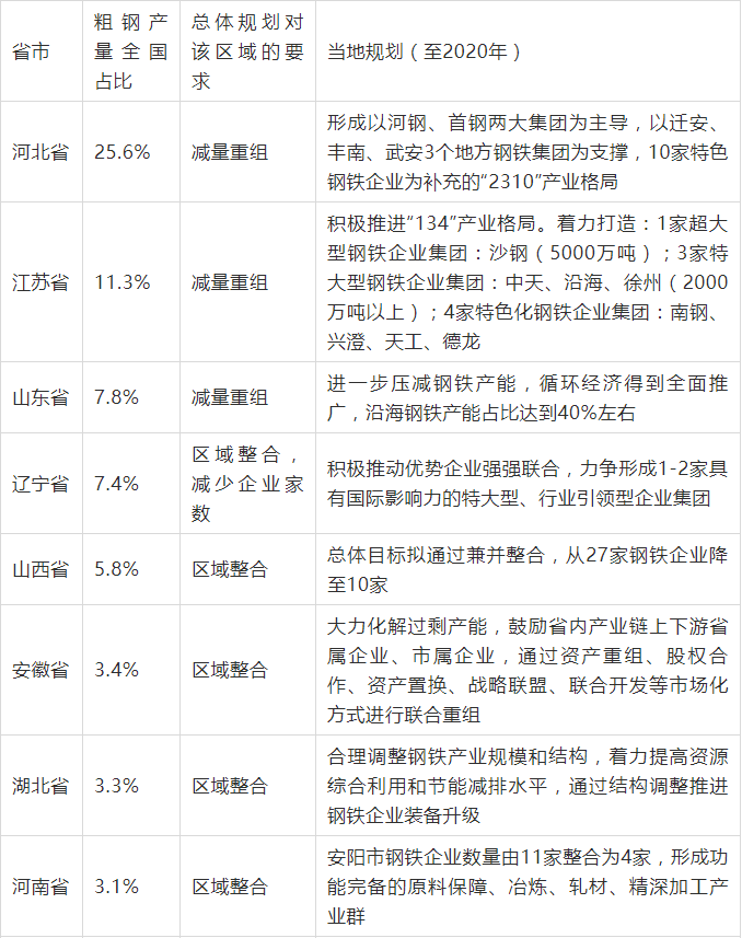 国内粗钢产量前十大省市关于钢铁行业兼并重组相关规划