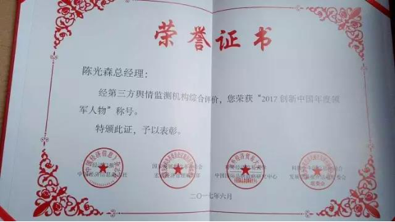 近日,2017中国创新与经济融合发展大会颁奖盛典在北京人民大会堂隆重举行,浙江之信控股集团及旗下遨优动力系统有限公司总经理陈光森博士分获2017创新中国(新能源)十大领军企业奖和2017创新中国年度领军人物奖。