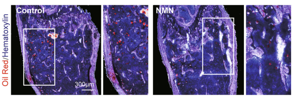 研究发现,在老年动物体内,干细胞因能量代谢失衡,成骨-成脂分化的平衡被打破,干细胞会更倾向于分化为脂肪细胞。补充NMN后,能够促进干细胞分化为成骨细胞,维持良好的平衡。因此NMN对于改善骨质疏松、肥胖有积极意义。