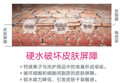 当用自来水洗脸沐浴时,水中大量的钙镁离子,会与洗面奶、沐浴露、洗发水等清洁用品中的皂基结合形成皂垢,皂垢的粘附性极强残留在肌肤表面,破坏皮肤屏障,使得皮肤锁水能力降低,水分加速流失,皮肤呈现干燥、起皮、易过敏等现象。