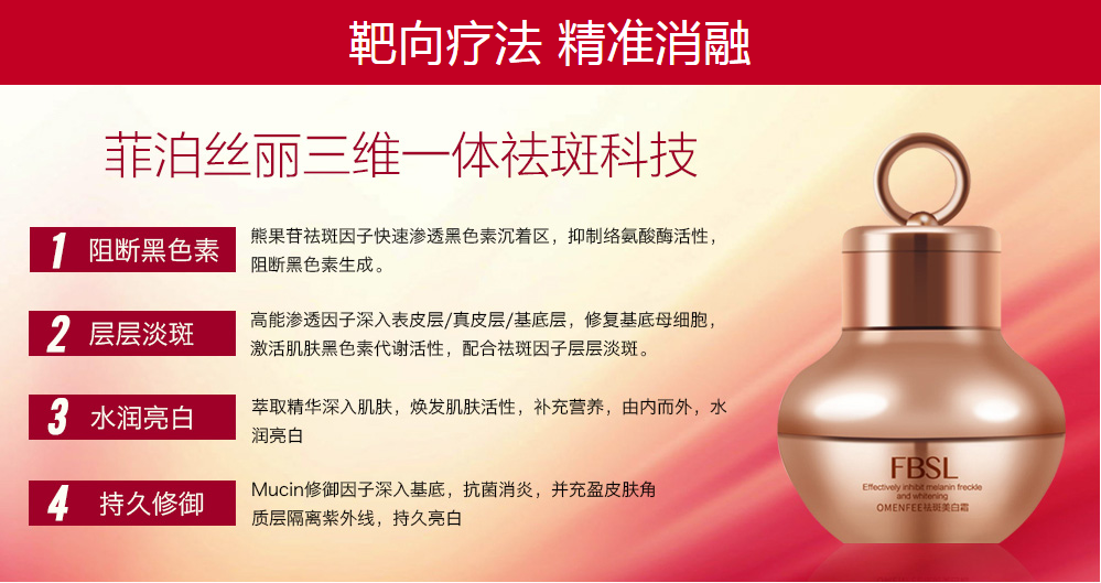 菲泊丝丽是一款能够深度祛斑的祛斑霜,主要成分有库拉索芦荟(美白嫩肤,改善肤色),熊果苷(深层祛斑,高效美颜),MUCIN(抗菌修复,隔离防护),纯植物配方温和不刺激,宝妈也是可以安心使用的,“天然安全祛斑”的理念,是菲泊丝丽23年来一直遵循的理念,承诺以最安全,最天然的方法,让你的肌肤呈现最完美的白净美,这也是为什么菲泊丝丽一直都备受用户关注与推崇的原因!此外这也是市面上第一款祛斑美白为一体的祛斑霜,让你祛斑的同时更能美白嫩肤打造你的完美肌肤!