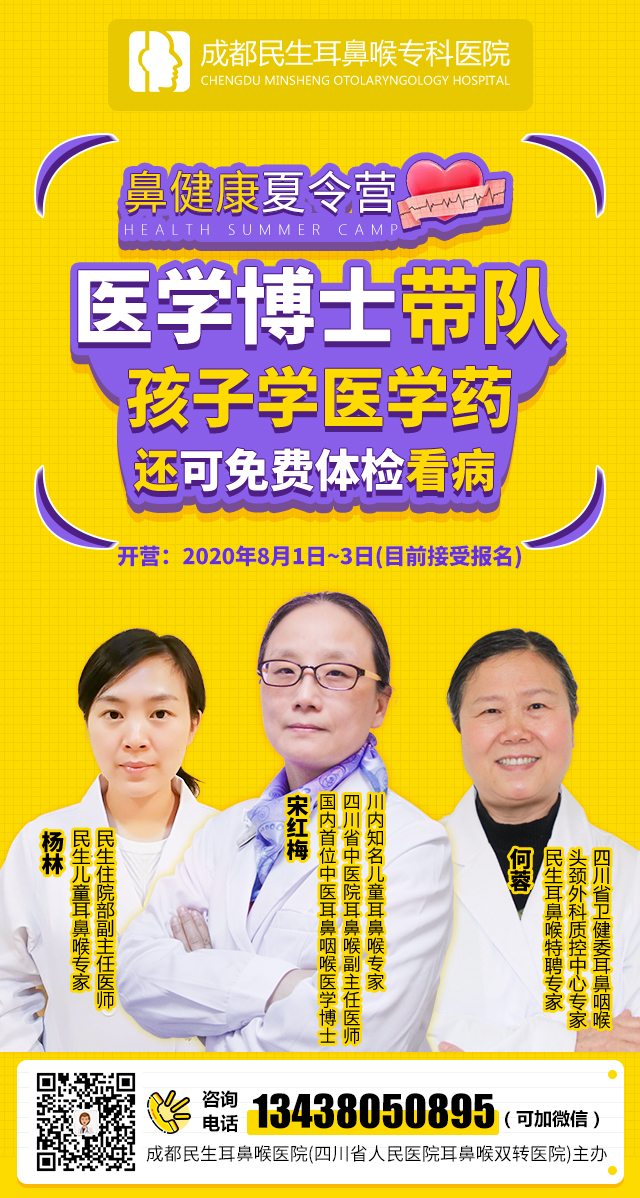 为更好地履行成都民生耳鼻喉专科医院的公益使命,关爱儿童,进一步提高儿童鼻健康知识水平,定于8月1日-3日举办“鼻健康夏令营”,特邀中国第一位中医耳鼻喉专业医学博士、中国中医科学院博士后、成都中医药大学附属医院耳鼻喉科专家、博士生导师宋红梅教授与家长和孩子们面对面交流,传授鼻炎防治知识,亲手为孩子诊断病情,教导孩子成为一名耳鼻喉小医生,培养孩子爱鼻护鼻的健康理念。