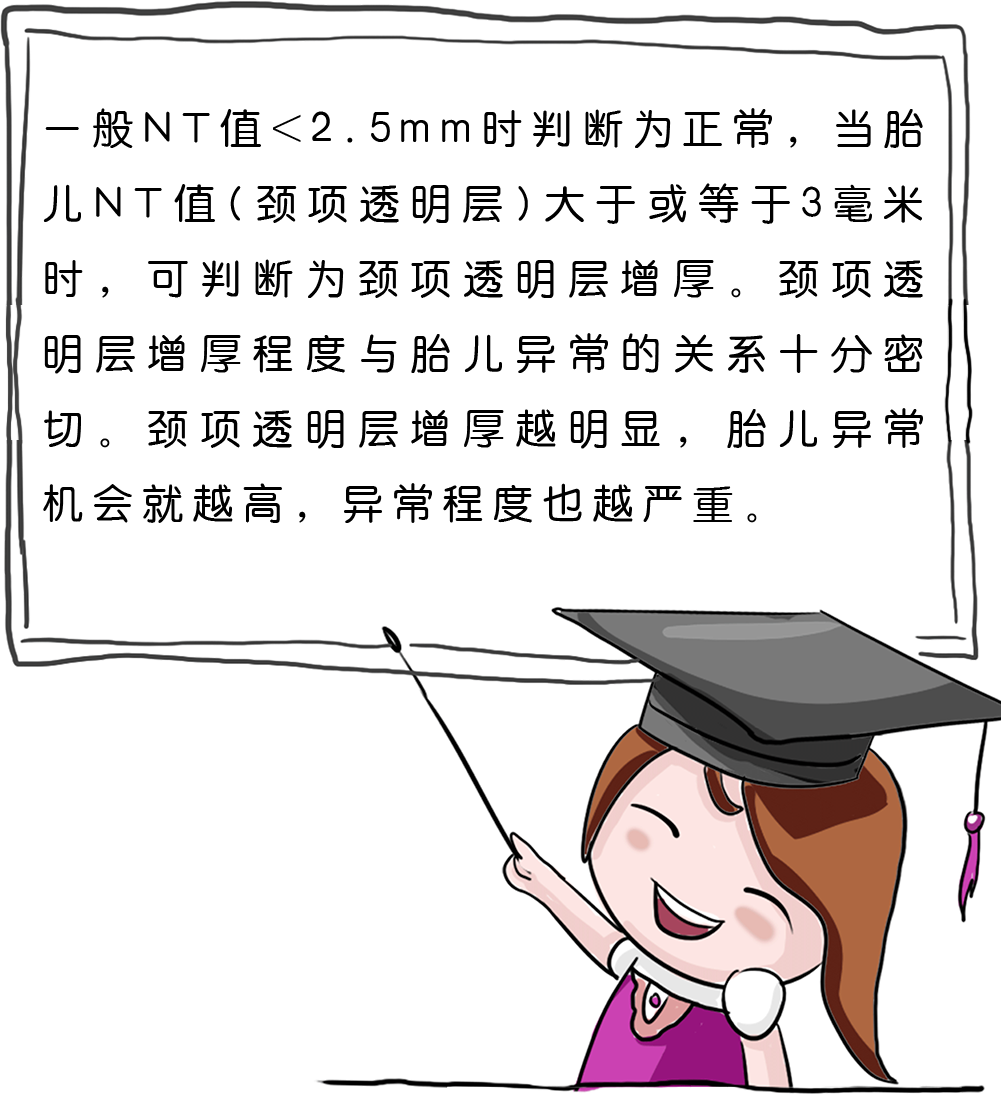 NT检查通常在孕11~13周+6天进行。11周之前扫描从技术上来讲很困难,因为胎儿太小,而过了14周,过多的液体可能被胎儿正在发育的淋巴系统吸收,结果不准确。