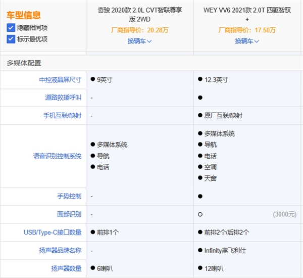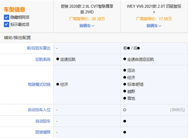 相信在购车前,准车主肯定会纠结于自主or合资的选择!相对而言,合资品牌有历史底蕴,但自主品牌发展至今,品质早已不可同日而语。为了替选择恐惧症解决这个难题,我以合资代表日产奇骏(2020款 2.0L CVT智联尊享版 20.28万起)与自主代表WEY VV6(2021款 2.0T 四驱智驭版 17.50万起)为例,将它们进行一番比对,优势劣势清晰可见。