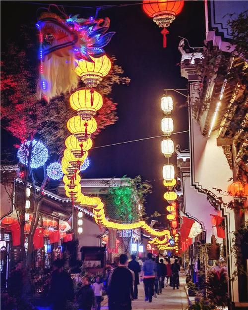 绚丽缤纷的彩灯将独具特色的徽派建筑装点的更加梦幻,增添了几分奇幻浪漫。精彩的演艺多种多样,让人眼花缭乱。非物质文化遗产打铁花表演带来超震撼视觉冲击力,点点星光在空中绽放成花朵,精彩绝伦。温婉的江南姑娘伴着夜色起舞,绝对是鸠兹古镇的一道靓丽风景。漫步在古色古香的街道上,在情趣盎然的街边酒馆,听一段故事饮一杯小酒,开始浪漫夜生活。还有有趣美味的夜市小摊,吃喝玩乐购一应俱全,真是一次超完美体验。