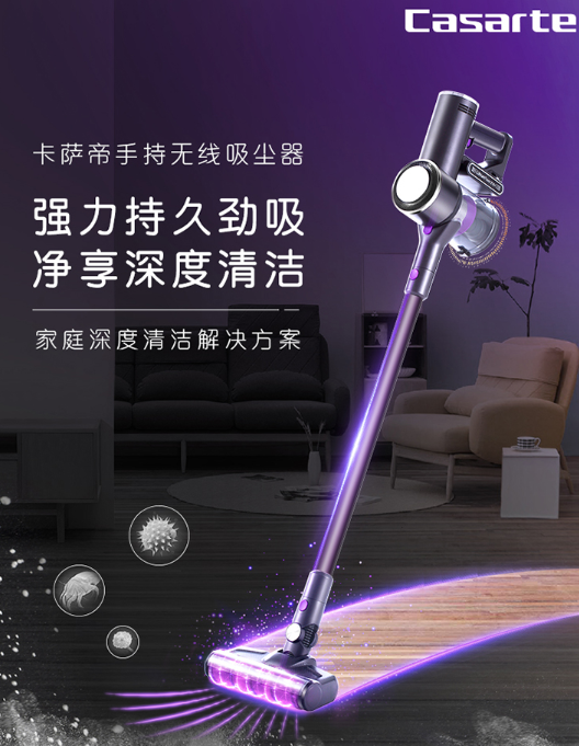 卡赫吸尘器具有无线轻盈、快速强劲、高效除螨和持久续航等四大特点,实用性很强。