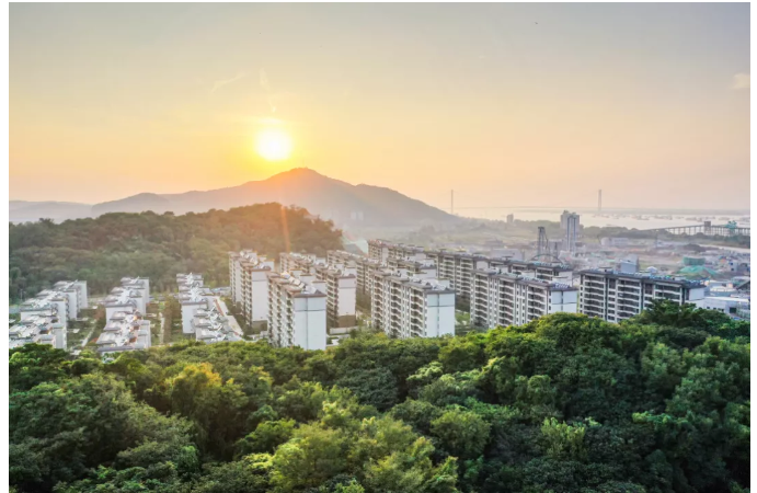 7月,初夏的傍晚,微风轻拂,我们来到华侨城翡翠天域已经交付的一期住宅小区。夕阳西斜,翡翠天域简洁时尚的建筑外立面,映衬着小区对面葱葱郁郁的山体和草坪,相得益彰,无限美好。