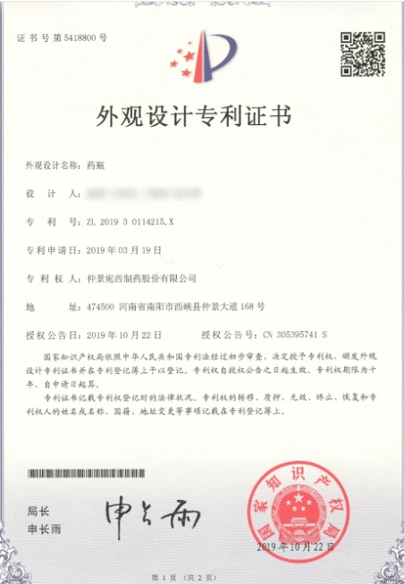 仲景品牌丸剂新瓶型已获国家知识产权局外观设计专利(ZL201930114215.X)和实用新型专利(ZL201920364948.3)