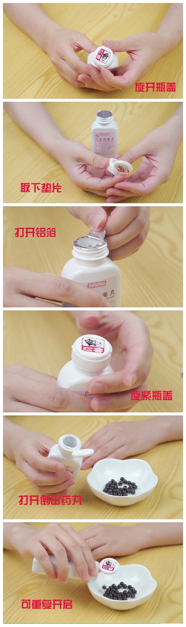 首先开启方便。拧开瓶盖、揭开铝箔封口,倒出药丸后再把盖子旋紧合紧即可,随后每次服用时只需轻轻推开瓶盖最顶部印有仲景logo的小翻盖即可倒出药丸;