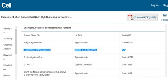 David Sinclair发表研究中的NMN原料使用表显示为赛立复原料