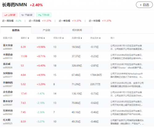 近期,A股市场持续火爆,虽有震荡下跌,但仍有多个板块呈现持续涨停,概念股“长寿药NMN”就是其中之一。截至7月23日,概念股“长寿药NMN”已经创出连续9天8个涨停的繁荣景象,雅本化学、金达威、兄弟科技、红太阳等集体涨停。由此可见,资本市场对于NMN板块的追捧热情非常之高!