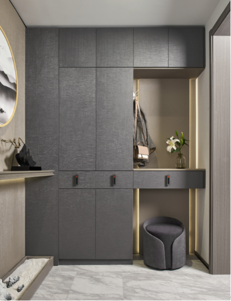 很多人家的入户玄关只是用了一个小小的鞋柜用作分隔空间,但每天回家看见散落一地凌乱的鞋子,总是让好心情打了折扣。在柏厨集成家居概念中,玄关虽小,可该有的功能配置不应舍弃,试想一下每天迎接你回家的是整洁而散发着温馨暖光的玄关柜,舒适感是不是油然而生呢?换鞋凳也是让幸福感飙升的小细节,很多人觉得换鞋凳占地方还不实用,穿鞋脱鞋只需要一会儿,将就一下就好了,可是你一旦产生了将就的想法,生活的品质也因为随处存在的将就而降低了。所以,柏厨把换鞋凳收纳在柜体之下,融为一体的整洁感令深度强迫症都能舒适。
