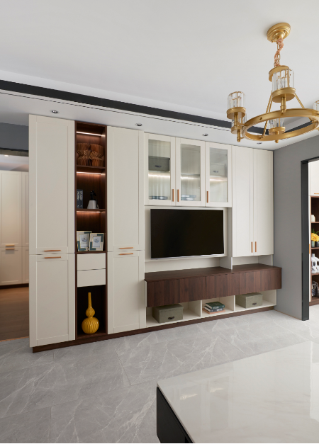 客厅是家庭中的开放空间,是家庭成员最主要的活动空间,也是客人来访最能感受主人家生活品味的空间,所以客厅的打造是重头戏。为了不显空间的厚重局促,选择依靠墙体做顶天立地式的背景墙收纳柜是很好的选择,柏厨集成家居茶卡提供的解决方案是将科学的三大功能融为一体,分区装饰、收纳两不误,玻璃吊柜若隐若现藏的是品质,高柜收纳区大方展示的是生活的幸福。优雅大方,经得起推敲的细节设计,就算是只为取悦自己,柏厨茶卡,足以!