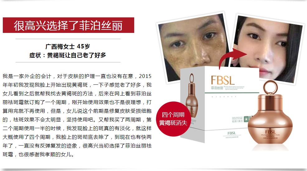 另外,菲泊丝丽作为一款专业有深度的祛斑霜,在面对每个人肌肤问题上也是做出了大量的临床测试,菲泊丝丽相关负责人表示:经过大量的实践,菲泊丝丽祛斑霜对于敏感肌、混合肌等等一切性质的肌肤也都可以使用,另外,孕妇或者是在哺乳期的宝妈也同样适用。菲泊丝丽负责人进一步表示:菲泊丝丽无论是从祛斑效果还是安全角度考虑,是一款真正意义上为有斑人士量身定做的深度祛斑霜。