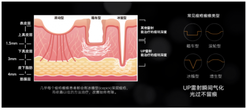 遗憾的是,光束无法穿透这个深度,无论治疗多少次,很难彻底修复痤疮瘢痕。有了穿透深度最大可达4mm的UP雷射,不论是治疗冰锥样的深层痘坑,还是大部分烧伤及手术瘢痕(如剖腹产瘢痕),都能彻底解决。
