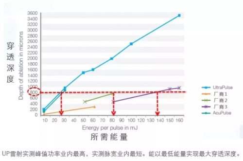 在超脉冲这点上,UP雷射性能一骑绝尘,最大限度的压缩光时间、提升光能量,达到了皮下4mm的深度穿透,而这是其他二氧化碳激光都不具备的。UP镭射与其它点阵激光相比,在同等作用深度,UP所需能量较低,这就意味着UP镭射,在完成高效治疗的同时,舒适度高,停工期短。