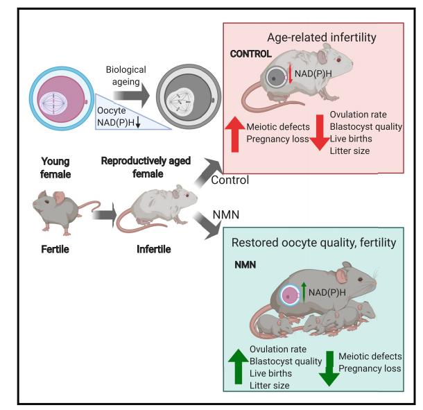 2020年2月新南威尔士大学医学院Lindsay E. Wu的研究组发表于Cell子刊的研究发现,NADH和NADPH在卵母细胞中的水平随着年龄的增长而下降,导致小鼠的卵母细胞功能失调,生育力下降。并证明对处于繁殖期而不孕的雌鼠补充NMN后可提升卵母细胞的NADH和NADPH水平,从而恢复卵母细胞质量,提高排卵率和生育能力。