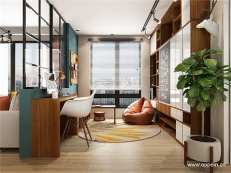 客厅除了可以看电视,也增加了更多学习区的功能。还可以在客厅利用隔断,设置一个开放式的阅读区。