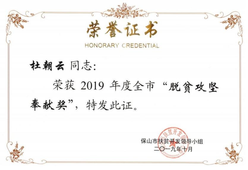 爱让杜朝云圆满而豁达,他怀揣爱心回报家乡。捐资助学、捐资助残、对点帮扶,杜朝云热衷公益,他带着使命感去创造社会价值,回馈社会。2018到2019年,杜朝云在脱贫攻坚中,贡献着力所能及的力量,对点帮扶的贫困村达到10个。他带领团队实地调研,根据乡村经济业态,因地制宜规划产业布局,努力让农产品走出大山,把农户的劳动成果转化成经济成果。