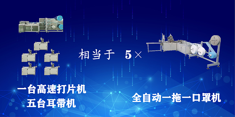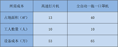 除了设备成本上的区别,两者在人员配置和占地面积上进行比较,笔者发现高速打片机配合耳带机的组合,设备占地面积不到全自动口罩机的一半。人工方面,以一台高速打片机配置2名工人,一台耳带机平均配置1.5名工人来计算,高速打片机组合和每台需配置2名工人的全自动口罩机差别不大。