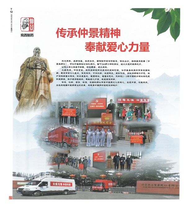 大疫无情,仲景有爱。当新冠疫情来势汹汹,仲景宛西制药毅然承担起企业的社会责任,秉承医圣张仲景仁心医术,快速响应、积极作为,累计捐款捐药超千万元,以实际行动为抗击疫情贡献力量。