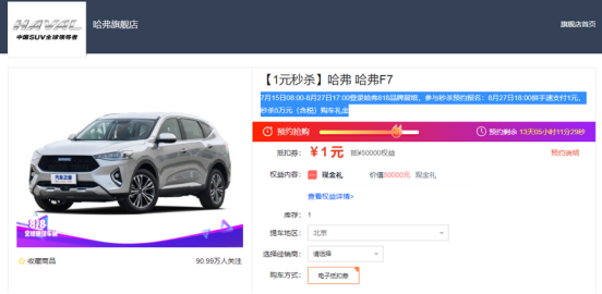 本次超级车展,用户购买2020款哈弗F7将享受高达30亿的红包福利,更能于即日起至8月27日17:00登录哈弗818品牌展馆,支付1元预约参与秒杀活动,价值50,000元购车礼金将于27日18:00由拼手速的方式抽出,可谓“弗利”送不停。对于心仪这款“全球智能潮品SUV”的朋友而言,此超级车展入手可谓正当时。