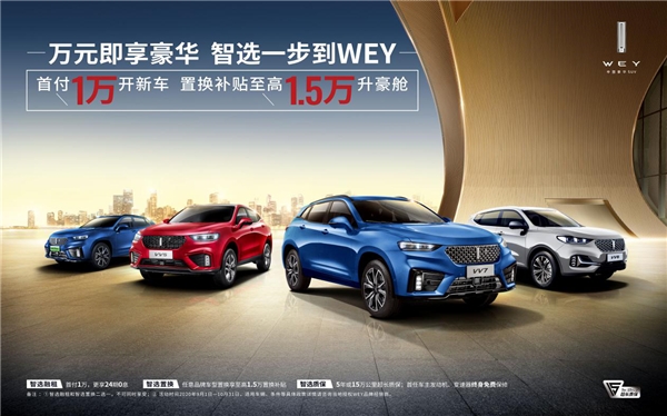 不仅如此,VV5的购入过程同样“有趣”,9月1日—10月31日,WEY品牌再次开启宠粉活动:万元即享豪华 智选一步到WEY。也就是说,现在入手VV5,大家其不仅可以享受至高10万限额贷,30期0息以及5年或15万公里超长质保,首任车主发动机、变速器终身免费保修的专属福利,同时还可以在首付1万,24期0息和任意品牌车型置换享1.5万置换补贴两者中二选一,给力。