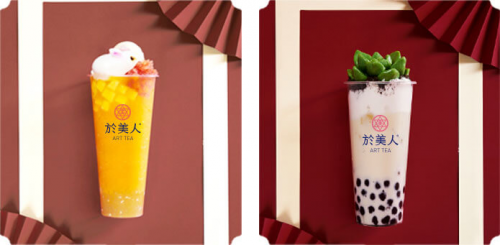第一点:於美人的品牌特点是独具优势的,看多了市场上奶茶的传统包装形象设计,花花绿绿好不惹眼,於美人一改传统奶茶的包装设计、店铺设计,采用古风美人的设计理念加上当下最符合年轻消费者的时代观点,让於美人在一种奶茶品牌中格外的显眼且突出。