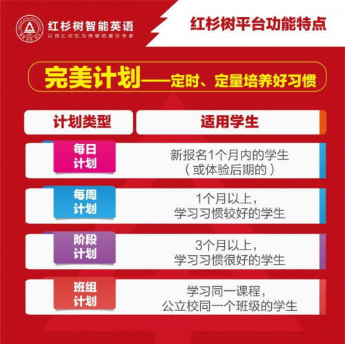 有了红杉树智能英语,老师会为每一个学生制定每日计划、每周计划、阶段计划等,要求孩子从开始学习就按照计划进行,复习、学习、巩固。再也不用担心孩子没有计划、没有目的的学习了。这些计划的核心价值就是定时、定量培养孩子的学习习惯,良好的学习习惯才能让学习效果大大提升。