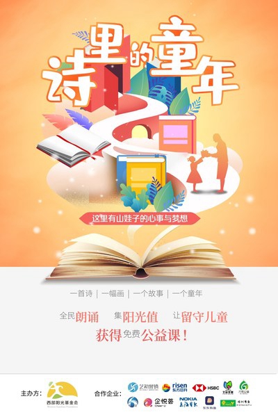 2020年10月15日,北京市西部阳光农村发展基金会联合深圳市罗湖区艺启梦想公益服务中心、杭州市六和青少年阅读服务中心联合发起“诗里的童年”全民朗诵公益倡导活动。山里的孩子们将无处诉说的情感与对生活的细致观察结合,写下了一首首充满灵性的小诗,画下了一幅幅具有生命力的画作。为了打破时空的阻隔,让更多的人看到大山里孩子的创作,西部阳光基金会将孩子们的诗歌与绘画搬到“诗里的童年”小程序中,普通用户可以通过朗诵诗歌、选择画作完成一次艺术品的再创作,用诗画传情,抚慰孩子们幼小的心灵,也带给自己与他人力量。