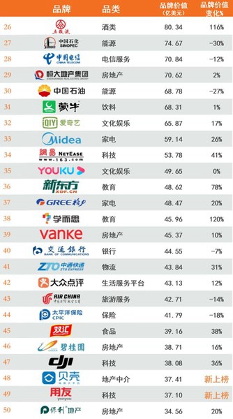 今年,有来自八个类别的16个品牌新上榜,其中五家来自科技品类,以短视频品牌抖音(第14位;169亿美元)和电子商务团购平台拼多多(第23位;95亿美元)为首。在新上榜的品牌中有五个独角兽公司(公司市值超过10亿美元的公司):视频分享应用抖音(第14位;169亿美元)和快手(第25位;86亿美元),房地产经纪自如(第71位;21亿美元),科技品牌今日头条(第67位;23亿美元)和知乎(第91位;10亿美元)。运动品牌李宁(第99位;8.48亿美元)继2013年首次上榜后,今年重新上榜。李宁顺应高涨的爱国主义热情推出了一系列庆祝中国文化和设计的产品,传递了国家自豪感,成功地提升了对年轻人群的吸引力。