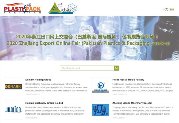 展会期间(10月20-30日),我们还将以视频会议的形式举办2020年浙江出口网上交易会(巴基斯坦站-塑料、包装专场),50家来自浙江省塑料及包装行业的企业将与百余家巴基斯坦包装、汽配、建材、食品等领域的专业买家进行线上交流,精准匹配、高效对接。
