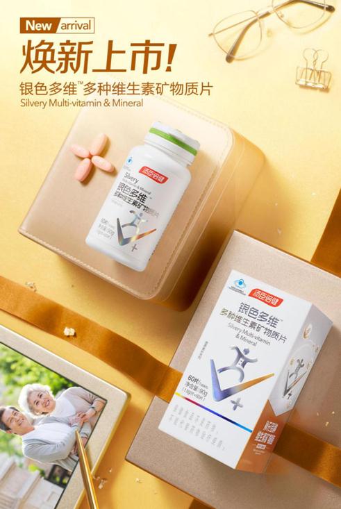 汤臣倍健银色多维中针对老年人的生理功能和营养需求进行营养搭配,含有17种老年人日常所需的多种维生素和矿物质,并为老年人强化补充额外需求的B族维生素、维生素D、维生素A、钙等营养素,每日1次,每次1片就能全面地为老年人均衡补充维生素,更有针对性,增强免疫力效果更出众。