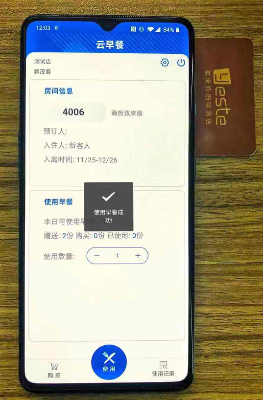 当客人来到餐厅用餐时,酒店餐厅员工可使用手机进入云早餐 APP刷客人房卡:如果VIP客人已在前台登记自助早餐的,系统将自动扣减,并自动发出使用成功的语音播报;