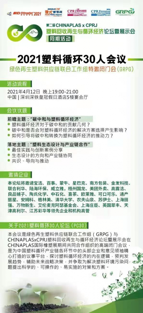 当晚19:00-21:00在会场酒店5楼宴会厅,绿色再生塑料供应链联合工作组(GRPG)与本论坛共同合作高端闭门会议——2021塑料循环30人会议。该会议探讨塑料循环经济的内在逻辑,预判发展趋势,辅助未来战略决策,并争取为解决塑料环境污染问题提出科学的、可操作的、易实施的对策和方案。