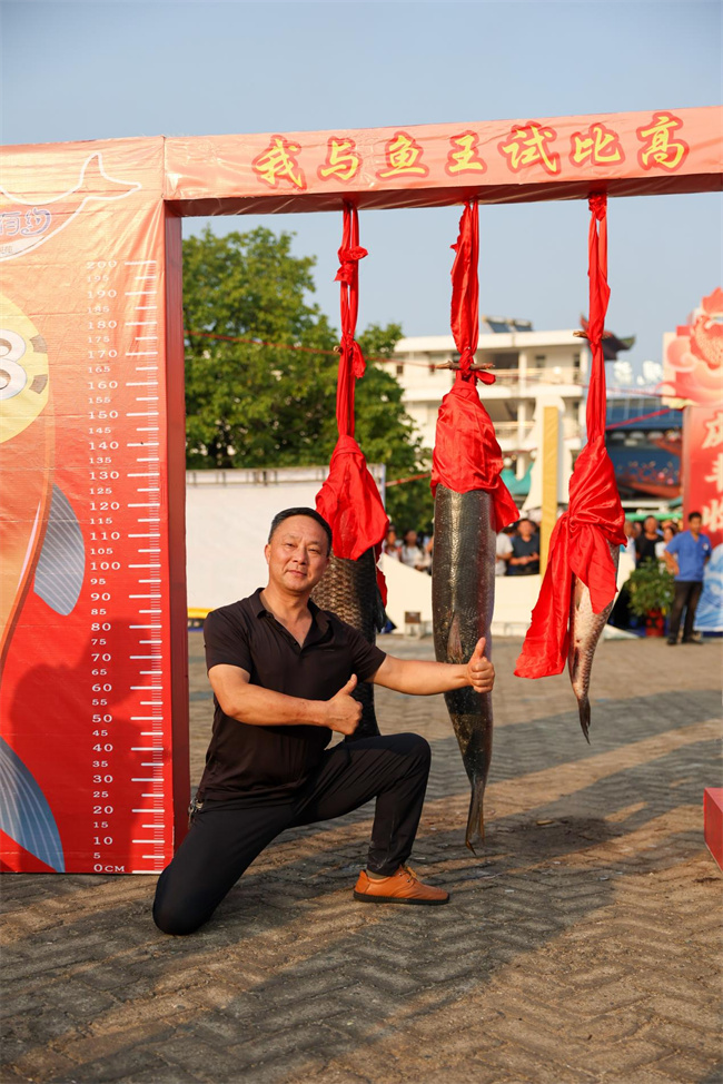 丹江渔民扛着长1.5米,重近百斤的鱼王走上主舞台,向四海来宾展示着丰收的喜悦。