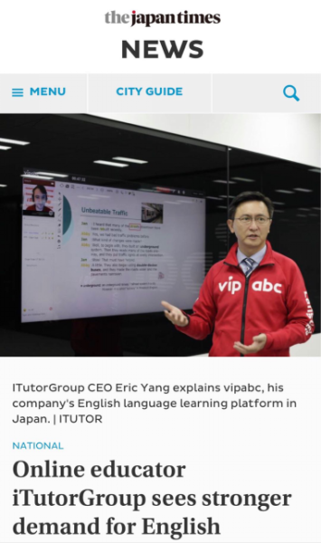 6月13日,日本最具影响力的英文报纸《日本时报》(The Japan Times)刊发对iTutorGroup创始人兼CEO杨正大博士的专访报道。他表示,除日本外,TutorABC母公司iTutorGroup正在寻求机会将在线教育事业拓展到韩国,最终到达包括拉丁美洲在内的其他地区。