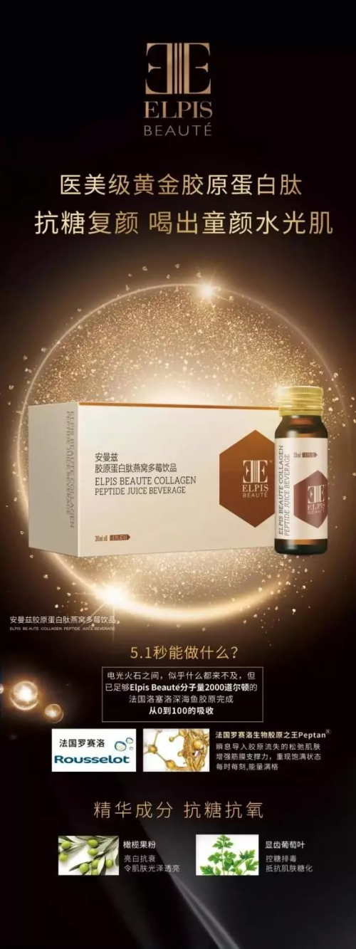 ELPIS安曼兹胶原蛋白肽燕窝多莓饮品,结合最易人体吸收的悬浮凝胶技术,将胶原蛋白经过了人工蛋白酶处理以后,形成小分子多肽(小于2000道尔顿分子量),也就是拥有“生物活性胶原之王”之称的法国罗赛洛Peptan®胶原蛋白肽。其分子量小,人体吸收率可达到90%甚至以上,相比市面上同类产品来说,美容功效更为显著。ELPIS安曼兹胶原蛋白肽燕窝多莓饮品成分包含:水、胶原蛋白肽、蓝莓汁、树莓汁、巴西莓粉、橄榄果粉、燕窝、显齿蛇葡萄叶、维生素C等成分,饮用口感好,果味十足,更易于人体吸收。