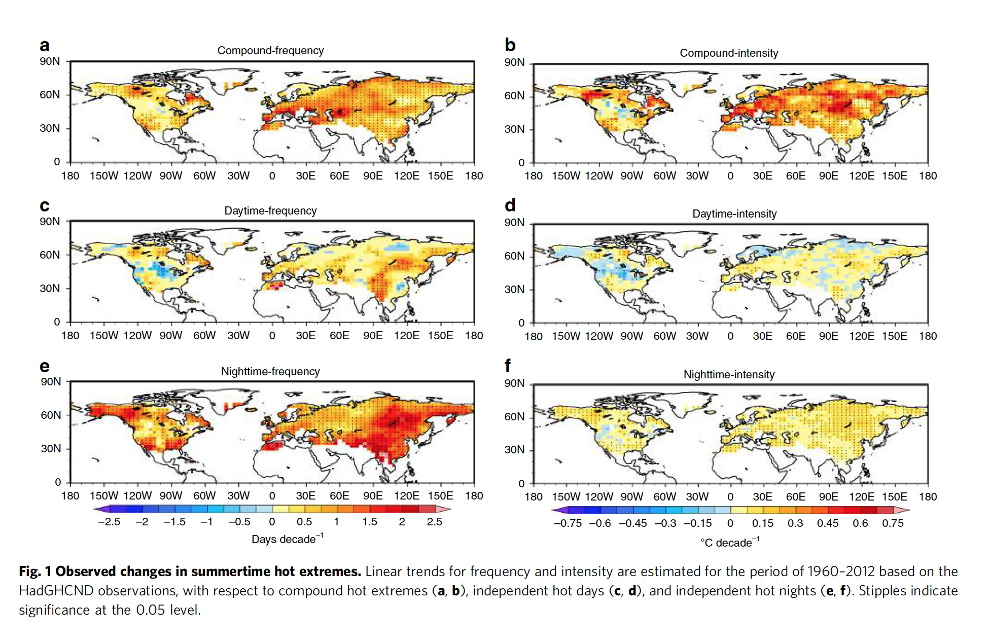 研究中,中国气象科学研究院灾害天气国家重点实验室陈阳与合作者分析了北半球1960年至2012年的温度数据,表明在此期间平均每十年约增加一天的复合极端高温,而且温度平均每十年增加0.28°C。统计分析证实,这种增加主要是由人为造成的温室气体排放引起的。