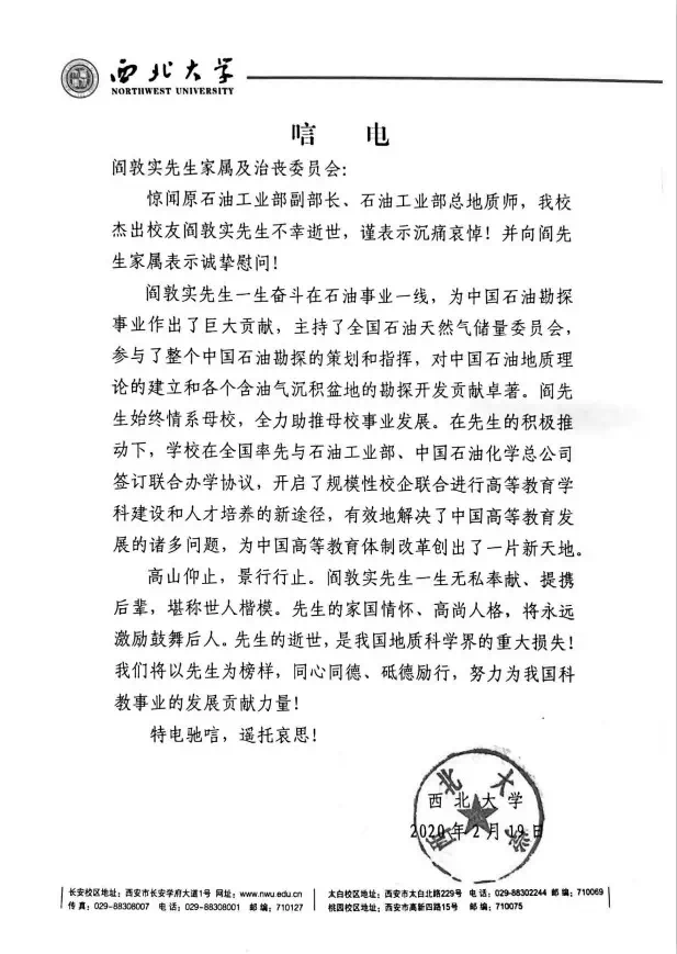 据西北大学校友总会2月19日消息,原石油工业部副部长、原国务院国有重点大型企业监事会主席,西北大学杰出校友阎敦实,因病医治无效,于2020年2月18日20时在北京逝世,享年87岁。